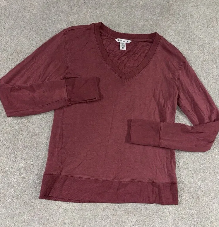 This is an Athleta Sunrise V-neck Sweatshirt in size XS, designed in a dark red color with a relaxed... Show more