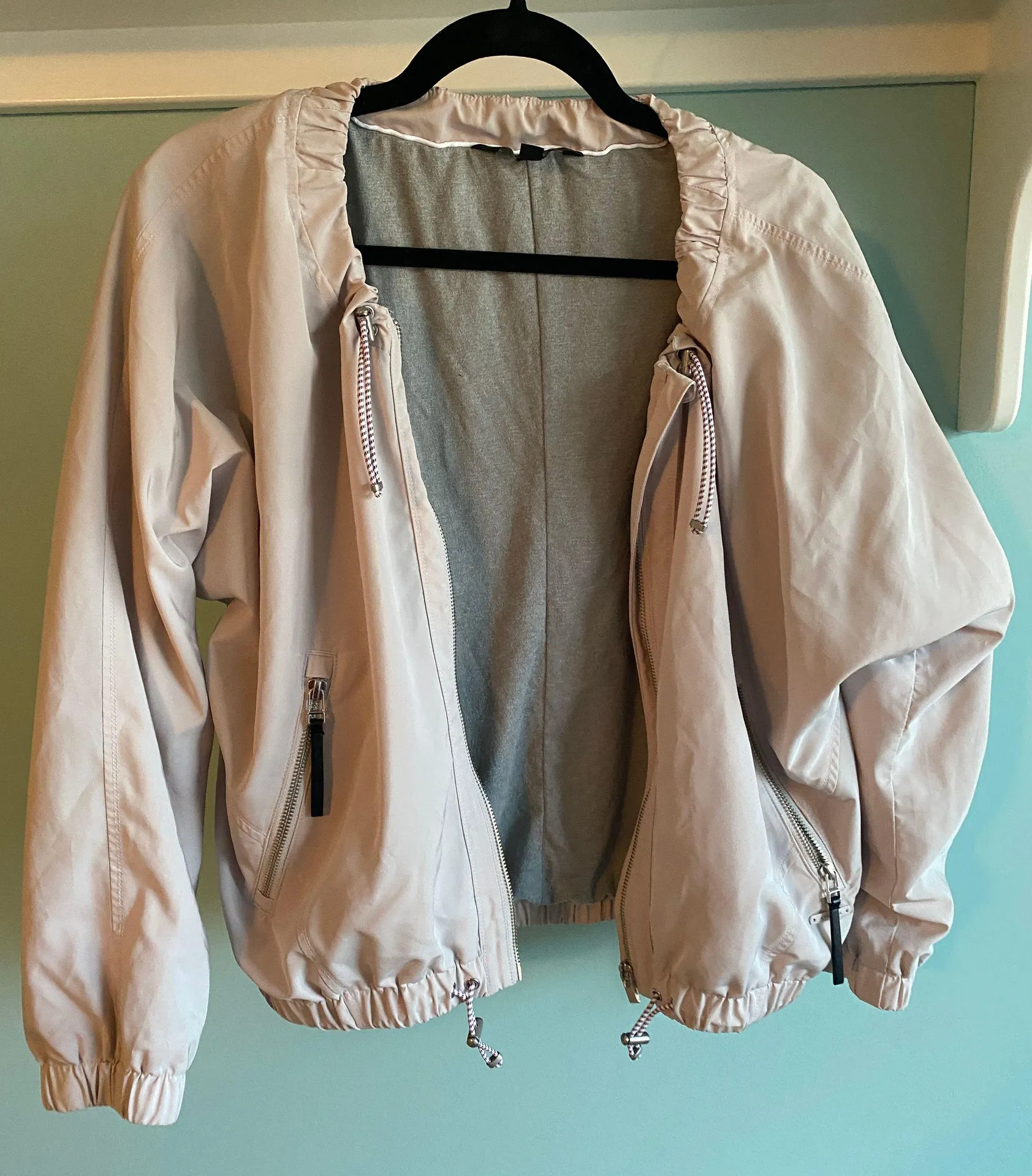 Light pink Athleta bomber jacket with gray sweatshirt like lining. In great condition! Perfect for h... Show more