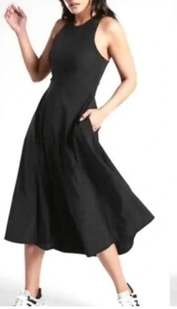 Athleta Winona midi dress solid black color way Size XS The dress has a mixed media fabric with.... Show more