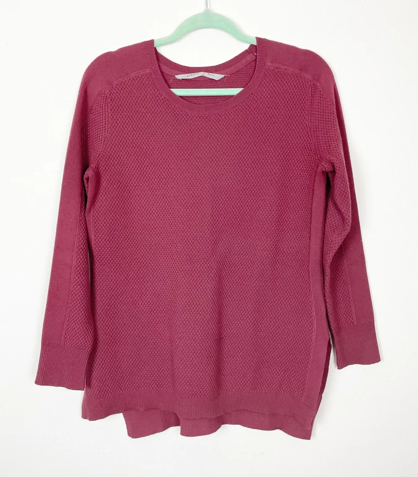 This is a brick red honeycomb knit side slit merino wool blend sweater from Athleta. Style 870515... Show more