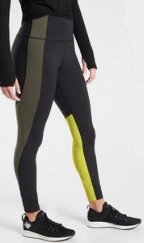 This is a pair of athletic high rise leggings from Athleta. They are in the style Asym Colorblock Ti... Show more