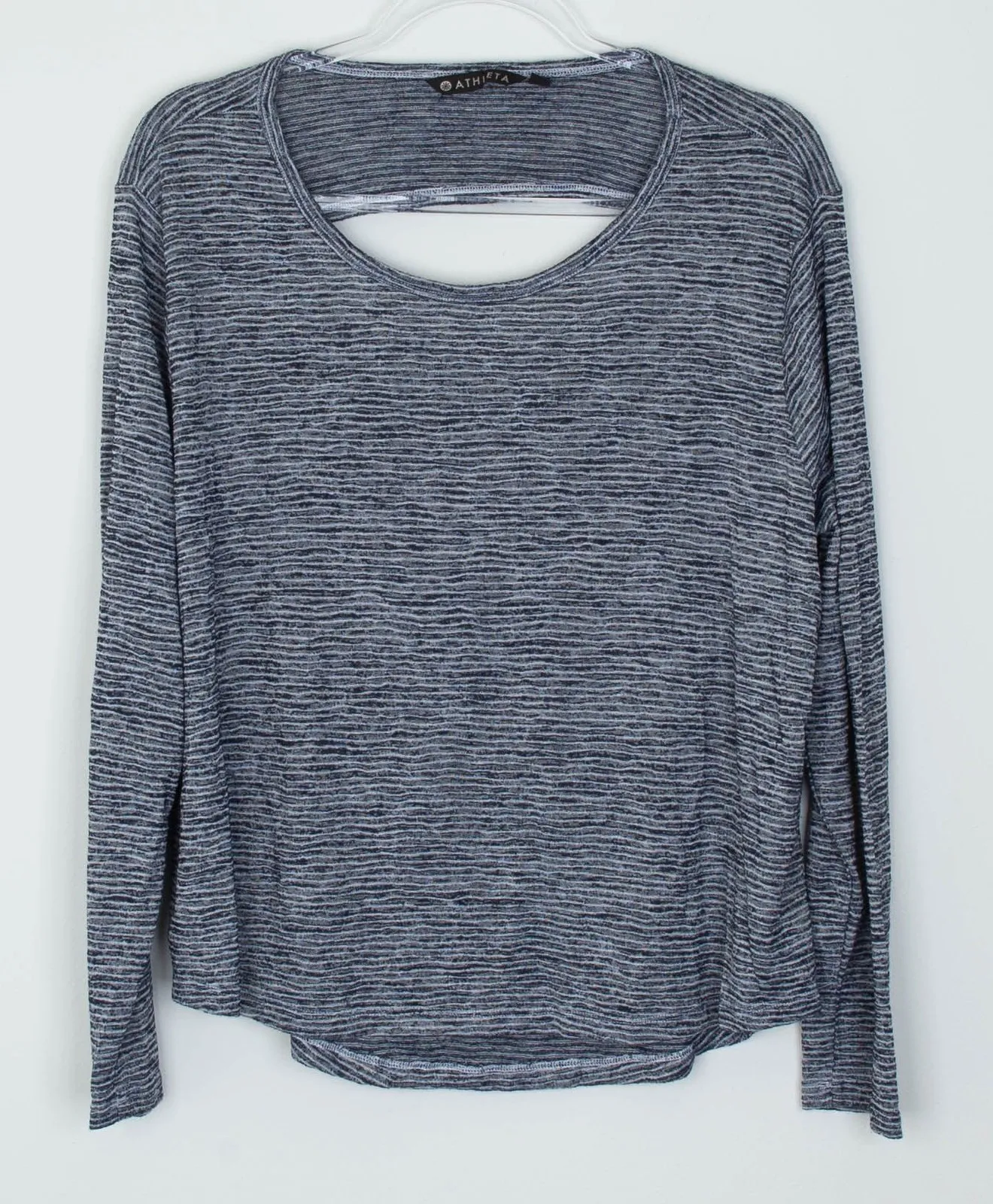 Athleta long sleeve top in a gray horizontal stripe pattern with a cutout detail on the back. This v... Show more
