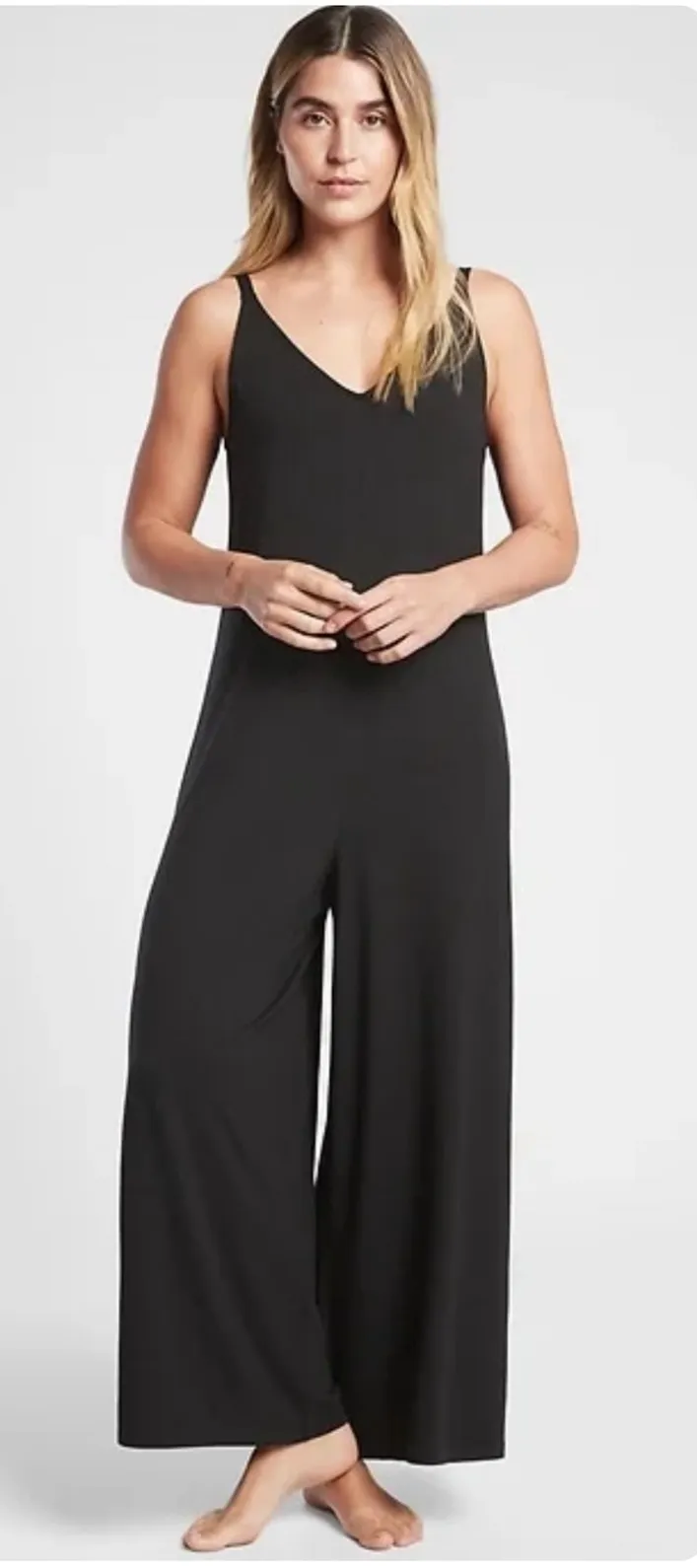 Keywords: Athleta, romper, jumpsuit, sleeveless, wide leg, black, v neck, casual, lounge, athleisure, comfortable, plus size, boho, summer, lounge, sleepwear, pajamas, loungewear, oversized, slouchy