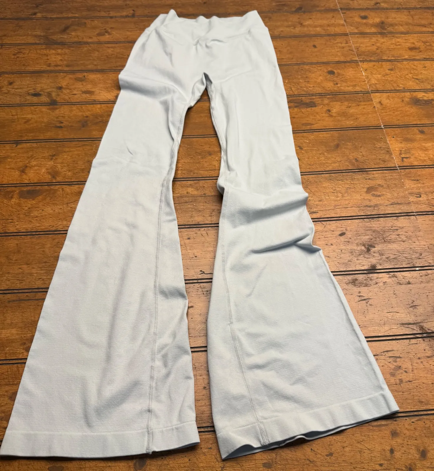 Athletic women's high-waist flare leggings in light blue. These seamless leggings offer a comfortable and flattering fit with a wide flare leg opening. Crafted for performance and style, they are perfect for yoga, workouts, or casual everyday wear. Keywords: Athletic Works, flare leggings, high waist, seamless, athletic, yoga pants, workout, activewear, loungewear, athleisure, bell bottom, performance, light blue
