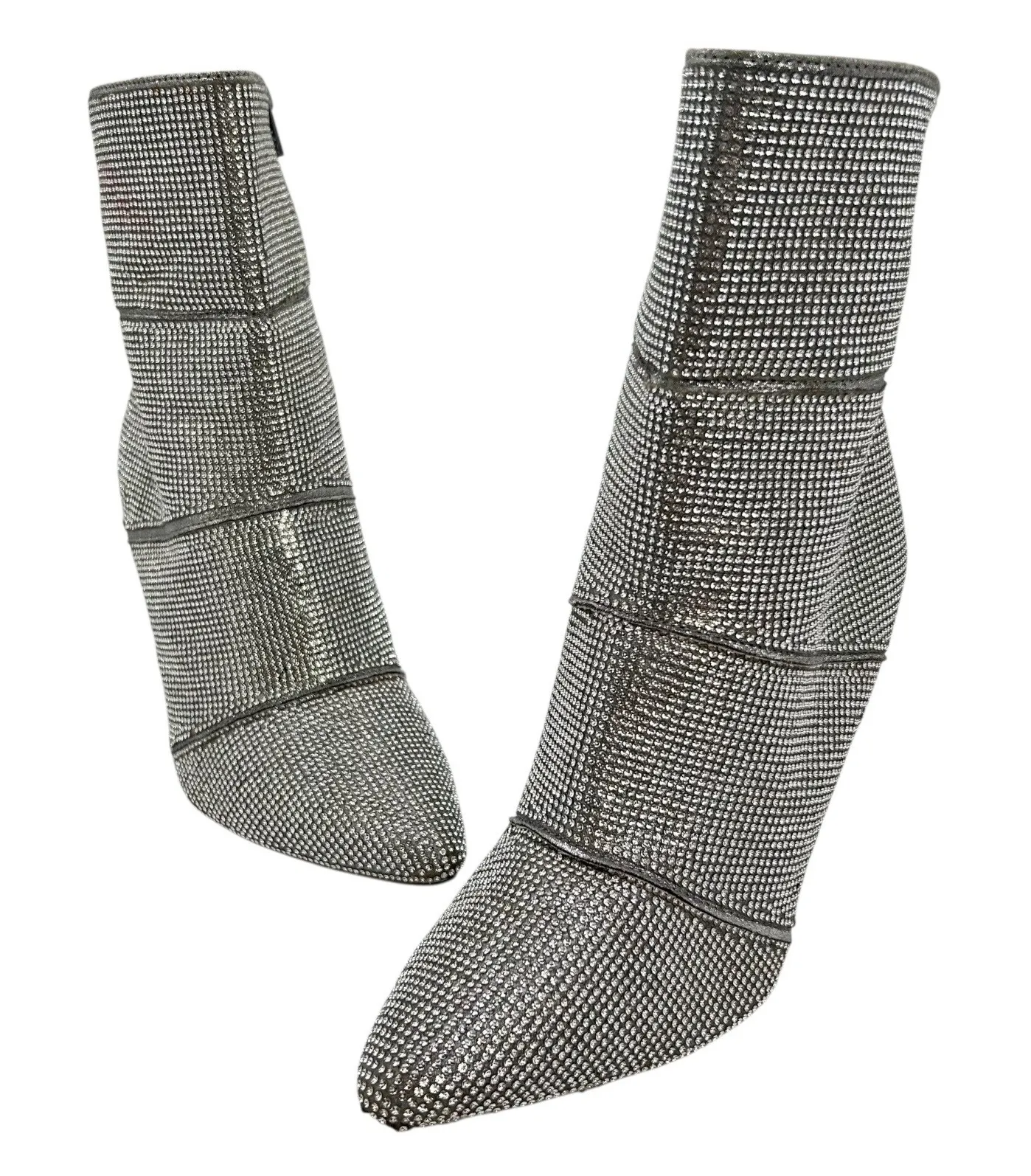 Features: Style: Bootie Shoe Shaft Style: Ankle Heel Style: Stiletto Occasion: Party/Cocktail, Formal Toe Shape: Pointed Toe Heel Height: High (3-3.9 in) Size: 7.5 Color: Silver Condition: Pre-owned **Fast Shipping / Smoke Free Home** Keywords: rhinestone boots, ankle boots, stiletto heel, party boots, sparkly boots, silver boots, womens boots, dress boots, fashion boots, evening boots, pointed toe boots, ATRENDY, size 7.5M, bling boots, glitter boots