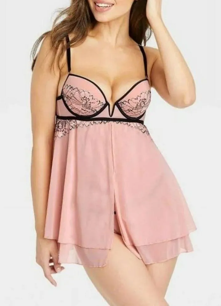 Auden Push-Up Loose-Fit Sheer Babydoll Dress in Ice Rose - it's a size Small and is NWT. Tag has sticker residue but doesn't affect the item. Tag states 2-pc but it's only the babydoll for sale, bottoms not included. Up your intimates game with the addition of this Women's Push-Up Babydoll dress from Auden. A pale pink hue and printed floral pattern on the cups gives this nightwear a sweet, feminine look. The cups are outlined in black fabric that matches the straps for a beautiful contrast, and are built with a push-up design that flatters your curves. A sheer construction makes it perfect for wearing on a romantic night, and the loose-fit, layered fabric of the dress gives this garment a dynamic look that moves with you. Please see size chart for bra measurements to ensure a good fit.