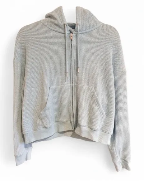 This is an incredibly soft and cozy Auden waffle knit full zip hoodie sweatshirt in a beautiful Baby Light Blue color. This item is in excellent use condition and has been carefully stored from a pet free, smoke free home. Worn only once and stored, it is practically Like New! The textured thermal waffle knit fabric is perfect for comfortable layering and is a versatile staple piece that fits the Athleisure, Normcore, and Minimalist style aesthetics. Key Features & Design Color: Soft Baby Light Blue (Also called Sky Blue, Pastel Blue, Light Blue) Size: Large (L) Fit: Cropped length with a Relaxed Fit silhouette. Fabric: Soft and textured waffle knit blend: 58% Cotton, 38% Recycled Polyester, 4% Spandex. Details: Hooded with a drawstring, ribbed cuffs and hem, and two front kangaroo pockets. Closure: Full zip-front closure. Approximate Measurements (Laying Flat) Pit to Pit (Chest): 23 inches Length (Shoulder to Hem): 18 1/2 inches (Cropped) Sleeve (Shoulder seam to cuff): 27 inches Care Instructions Machine Wash Cold with like colors. Gentle Cycle. Only Non-Chlorine Bleach if needed. Tumble Dry Low. Remove promptly. Cool Iron if needed.
