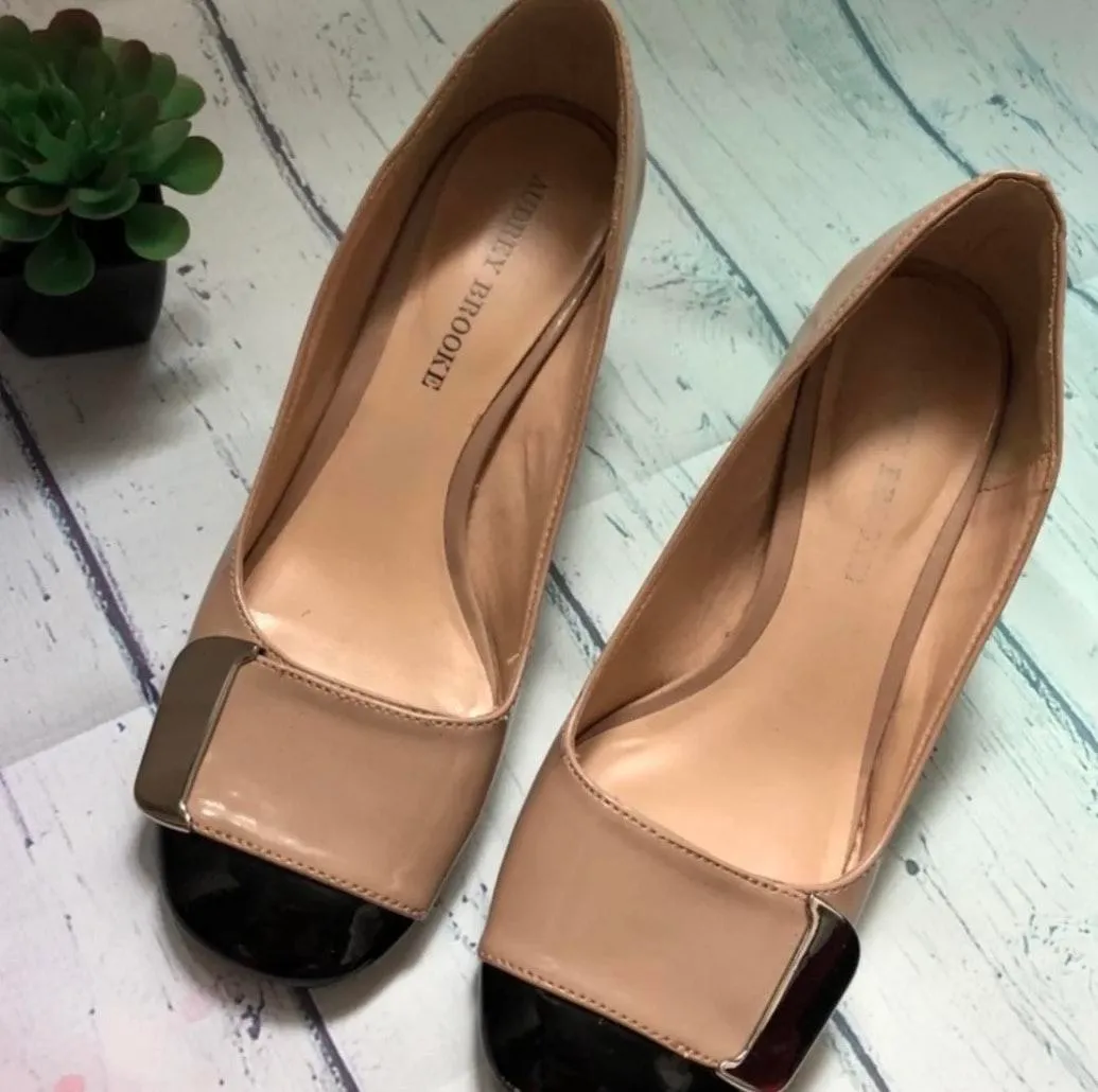 Audrey Brooke nude shoes. In nude and black with square heel •Style#: 3350949 •Tag Size: 7.5 •Excellent Used Condition •Flaw--Minor scuffing lower right side shoe LOC#716C *Approximated Measurements are taken while laying the garment flat •Shoe length 9.5” widest part in width 3” and 2-1/4” heel height