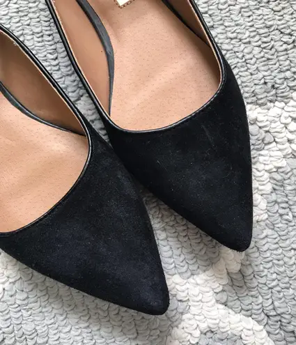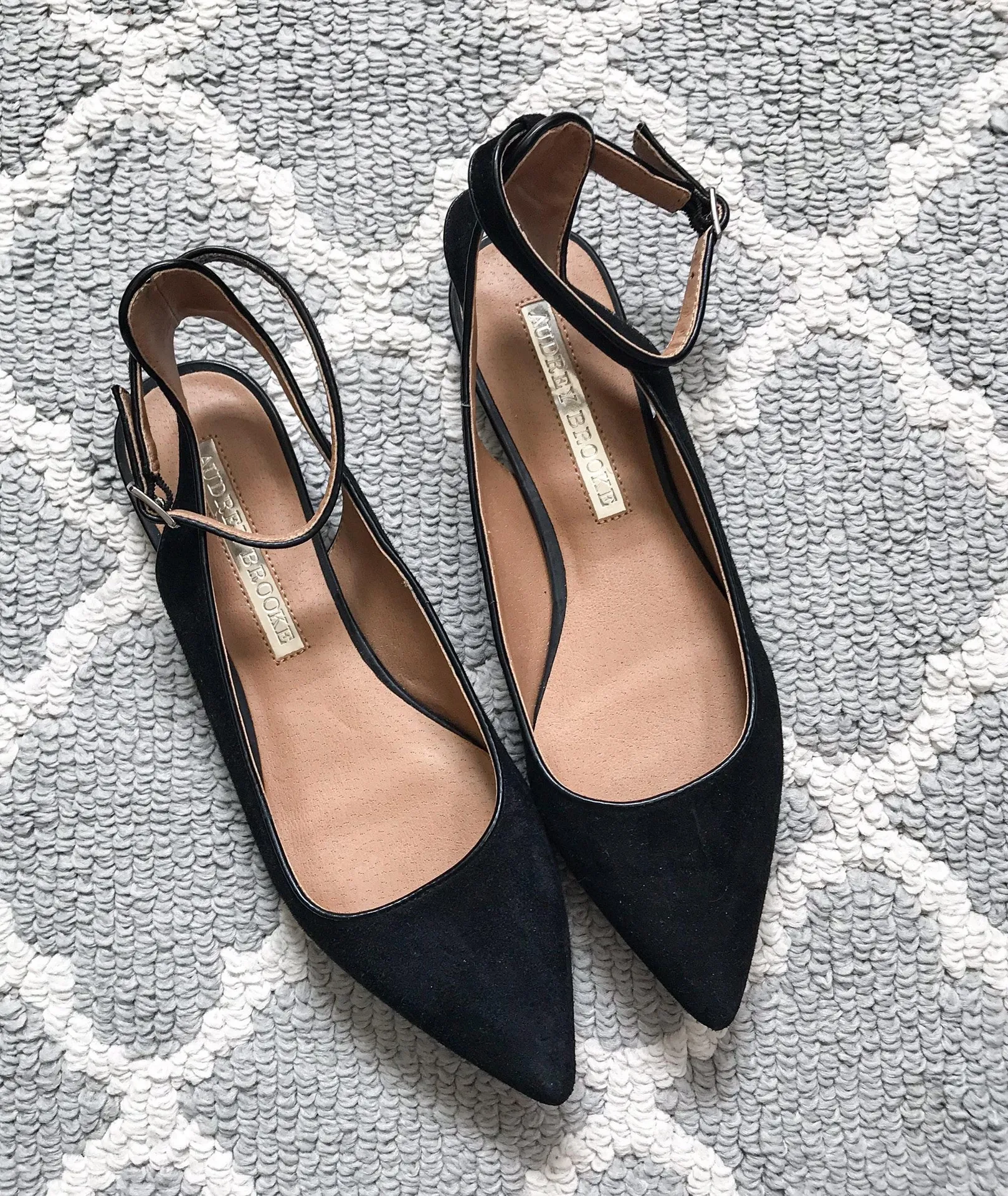 Brand: Audrey Brooke Naomi Black Suede Pointed Toe Ankle Strap ballet flat shoe Size 6, true to size Rarely worn, great condition Natural wear from use, as pictured Very minor scuffs on side and bottom, but not not noticeable on Perfect for everyday wear or work