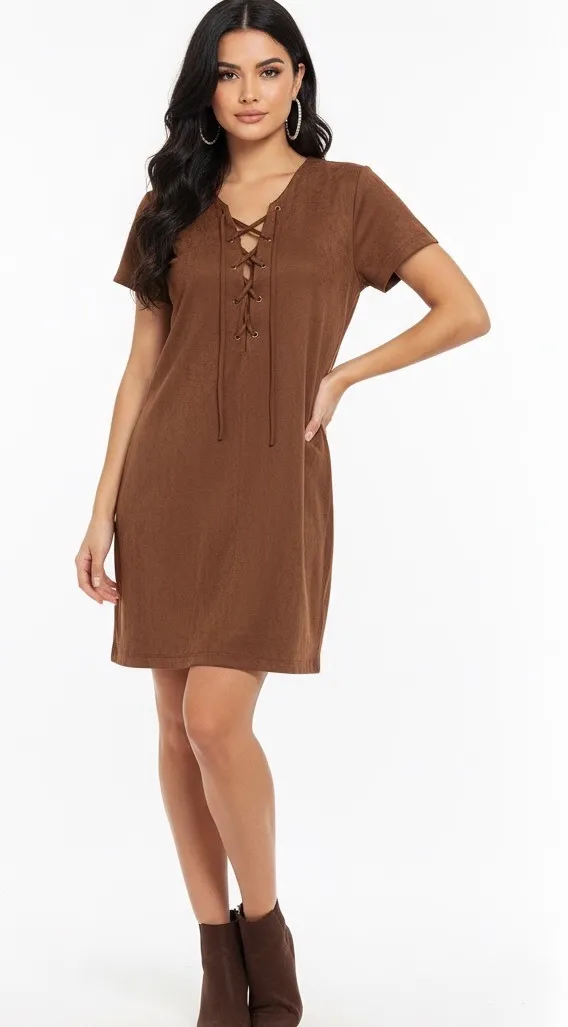 Size 4. Suede like material. Extremely nice like new! A brown suede lace-up tunic dress by Audrey. This dress features short sleeves and a flattering v-neckline with a detailed lace-up front. The relaxed fit makes it comfortable for everyday wear. Perfect for a casual outing or a laid-back weekend. Style: Shift, T-Shirt Dress Dress Length: Knee Length Department: Women Sleeve Length: Short Sleeve Pattern: Solid Occasion: Casual Material: Polyester Fabric Type: Knit Theme: Bohemian Neckline: V-Neck Season: Fall, Spring Sleeve Type: Cap Sleeve Closure: Lace Up Accents: Strap Features: Pockets