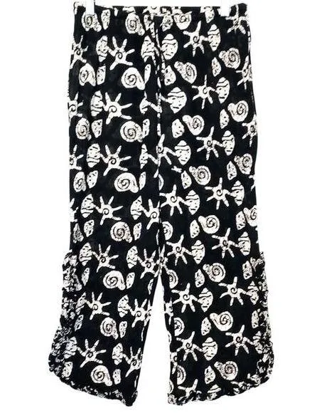 VINTAGE! 90’s Tropical Beach Black and White Crinkle Gauze Cropped Capri Pants Women’s Pants Cropped / Capri style pants Elastic waistband w/ drawstring Mid rise waist Side slit on leg hem w/ ruffle detail Crinkle gauze texture Black and white tropical beach sun and shell pattern UNKNOWN SIZE but fits like a women’s Small Approx. measurements: Waist: 13” Front rise: 10” Inseam: 24” UN26
