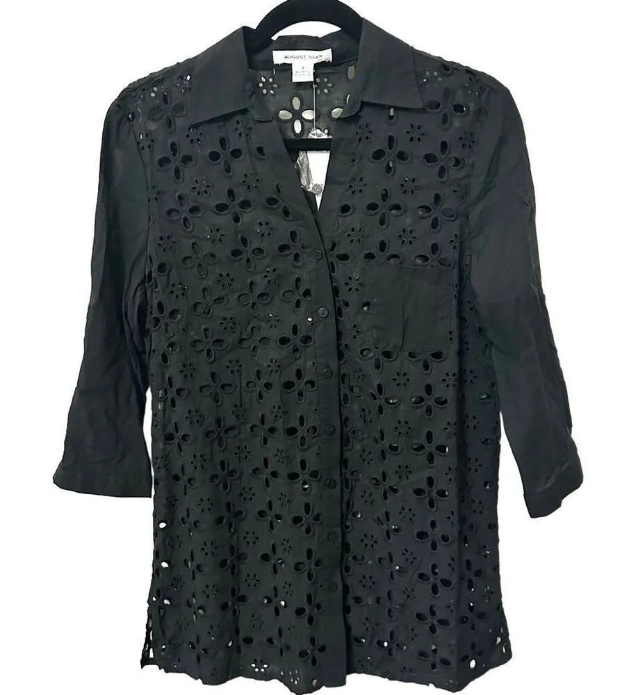 August Silk black long sleeved cut out shirt Can also be worn as a short dress Button down New with tags Front pocket of Arm has a button to stay rolled up Super cute top! Please see photos. They are part of the description. Happy to answer any questions. Check out my other listings - lots of jewelry! New listings every day. Thanks for stopping by!