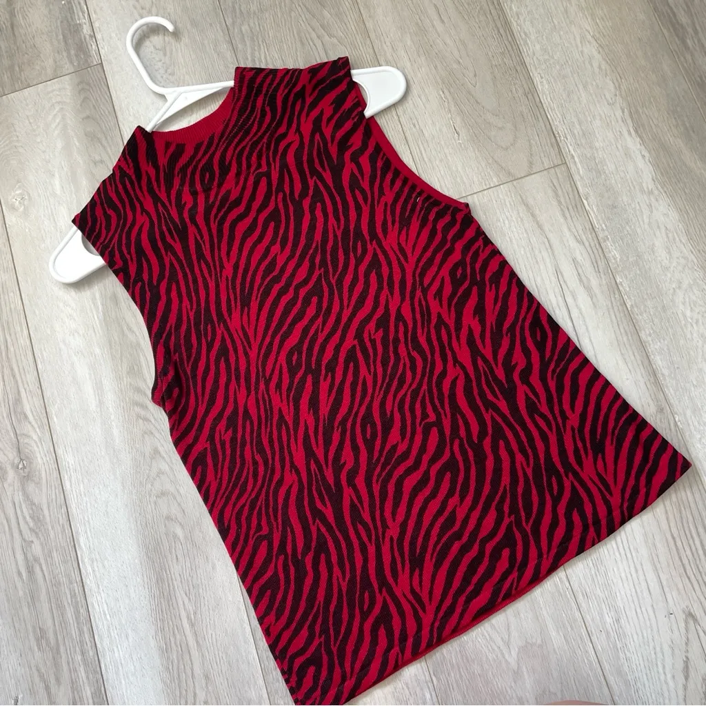 August Silk Zebra Print Tank Top in the color Red and Black. High mock neckline, sleeveless wide straps. Lightweight stretchy knit fabric. Zebra print. Size small, womens. In great pre-worn condition, no major issues. 100% silk. Super cute y2k, vintage, retro, indie sleeze, rock, outerwear, edgy style. //C390, 4.1