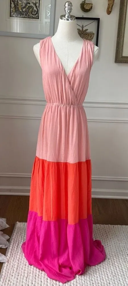 Aura Women's Sleeveless Colorblock Crinkle Maxi Dress. Sleeveless and lined. Crossfront top and stretchy elastic waist. Threaded loops at each hip for you own belt (we don’t think you need it but you can dress up or down easily by adding a belt). No fabric content tag. Laying flat measures 18” armpit to armpit, 12-17” across the waist and 59” shoulder to hem. $160 retail