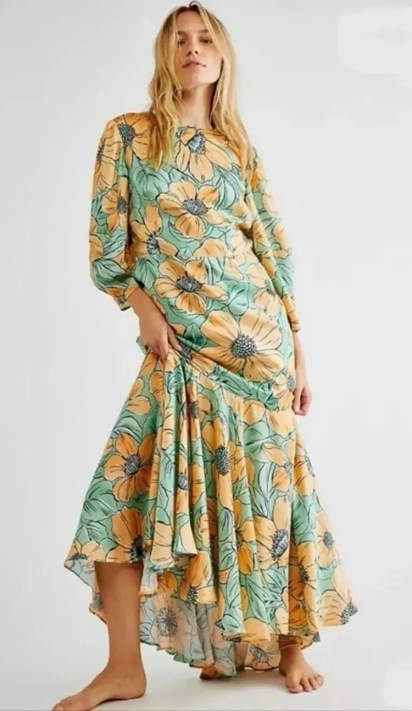 โจ Absolutely stunning designer collab! Autumn Adeigbo x Free People โPoppiโ Maxi Dress โ vibrant yellow & green floral print, fit-and-flare mermaid silhouette, long sleeves, and full lining. Retail price: $418 ๐ Details: ๐ธ Size 6 ๐ผ 100% Polyester (body & lining) ๐ฟ Made in the USA ๐ป Style: AASS21POPPI-D-G ๐ Zip closure on back Measurements Approx: Bust (pit to pit): 18โ โข Length: 53โfront / 58โ back Condition: ๐๐ผNew with tags. Has a few minor storage/display imperfections: โข A light mark near the waist seam. โข Slight fabric pulls on sleeves. Both are subtle and blend beautifully with the floral print โ barely noticeable when worn! See the last photos, Overall, an elegant showstopper piece that looks unworn and may have been on display in-store. Perfect for weddings, garden parties, or spring events ๐ผ๐ #AutumnAdeigbo #FreePeople #MaxiDress #BohoChic #MadeInUSA #FloralDress #DesignerStyle #SpringFashion #WeddingGuest