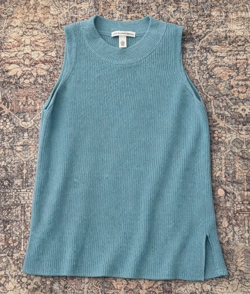 Autumn Cashmere 100% cotton sleeveless mock neck sweater top in a light blue hue. This knit top features a ribbed texture throughout and side slits for added detail and ease of movement.