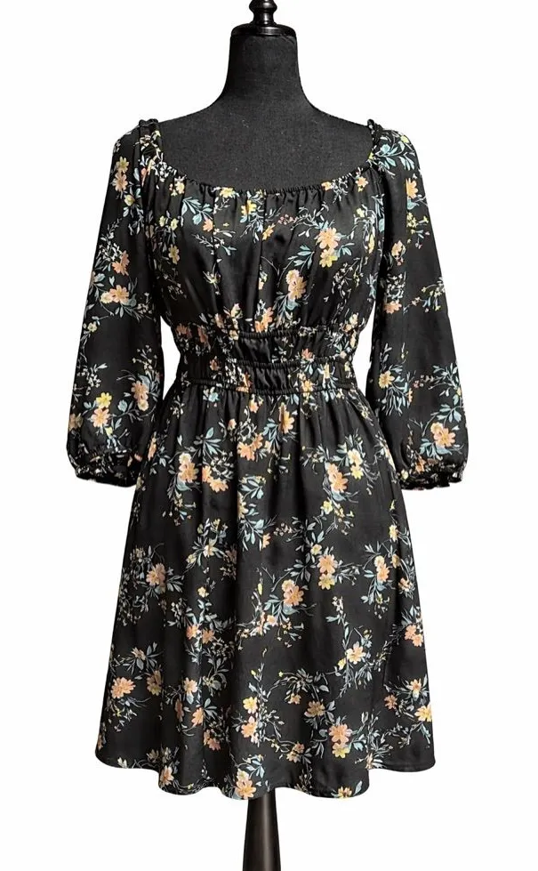 Feminine black floral mini dress by A.U.W featuring a flattering square neckline, long sheer sleeves, and a smocked elastic waist for a comfortable, cinched fit. Lightweight and flowy with soft floral print throughout. Easy to dress up or down for everyday wear, brunch, or casual outings. ⸻ Details • Brand: A.U.W • Size: Large • Color: Black with floral print • Style: Mini / short dress • Sleeves: Long sleeves with elastic cuffs • Neckline: Square neckline • Waist: Smocked elastic waist • Closure: Pull-on • Fabric: Lightweight woven (polyester feel)