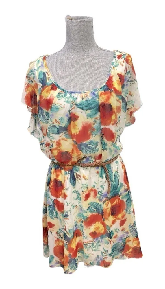 AUW FLoral Chiffon Blouson Dress L Braided Narrow Belt BRAND -AUW STYLE -Blouson COLOR -Multicolored Orange Floral FABRIC CONTENT -100% Polyester SIZE -L MEASUREMENTS- Bust - 40" Waist - 28"-30" Hips -42" Length- 31.5" front, 37" back