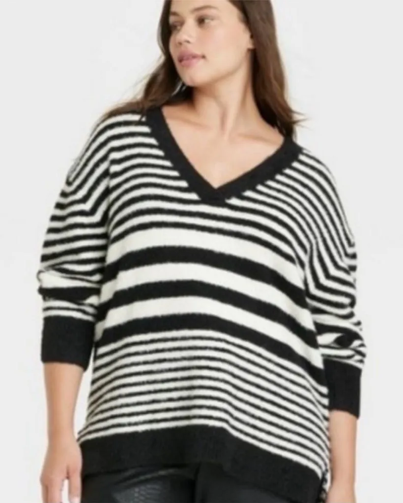 Ava & Viv Black & White Striped Soft Fuzzy Long Sleeve V Neck Sweater Featuring a flattering V-neckline and classic long sleeves, this sweater combines comfort and fashion effortlessly. The bold horizontal stripes give it a timeless yet modern feel, while the ultra-soft, fuzzy knit makes it irresistibly cozy for everyday wear. Whether you're layering it over leggings for a casual day out or pairing it with high-rise jeans and boots for a more elevated look, this sweater is endlessly versatile. The relaxed fit offers a laid-back silhouette that’s great for lounging, brunching, or staying warm on chilly days. It's a must-have for fans of cozycore, casual chic, and elevated basics. Perfect for fall and winter, this Ava & Viv pullover is a staple piece for anyone looking to stay warm without compromising on style. A great addition to your capsule wardrobe or sweater weather rotation, this one won’t stay in your closet for long. Long sleeves V neckline Pullover styling Striped - black and white Fuzzy soft material Nylon / recycled polyester / spandex Size: 1X plus Measurements are provided in pictures Condition: New with tags (NWT) tags: cozy winter outfit, fall layering, casual day out, coffee date, weekend brunch, work from home comfort, relaxed office outfit, cold weather style, holiday gathering, Thanksgiving dinner, Christmas morning, cozy night in, winter travel look, soft loungewear, comfy chic, stylish layering, sweater weather, cabin trip, snowy day outfit, winter