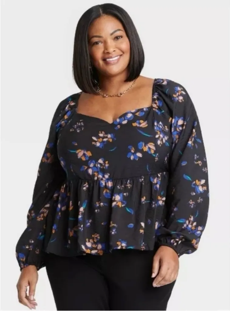 Ava & Viv Black Multicolor Floral Long Sleeve Smocked Peplum Top Designed to flatter all body types... Show more