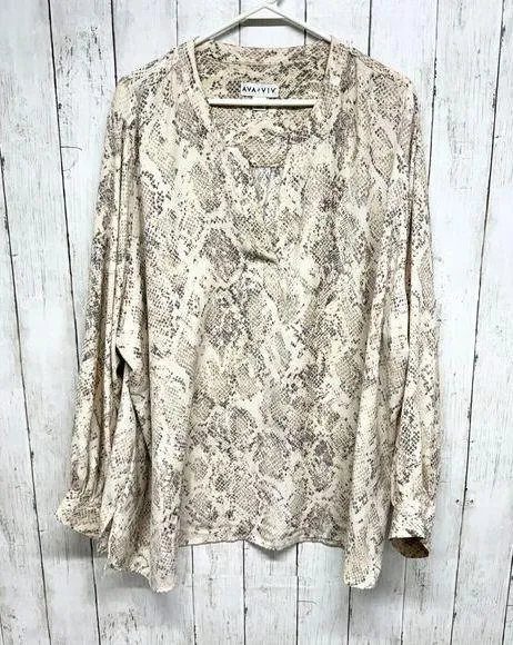 AVA VIV Blouse Women 4X Marble Flowy Snakeskin Wide Neck Deep V Neck Polyester Gently used. In fant... Show more