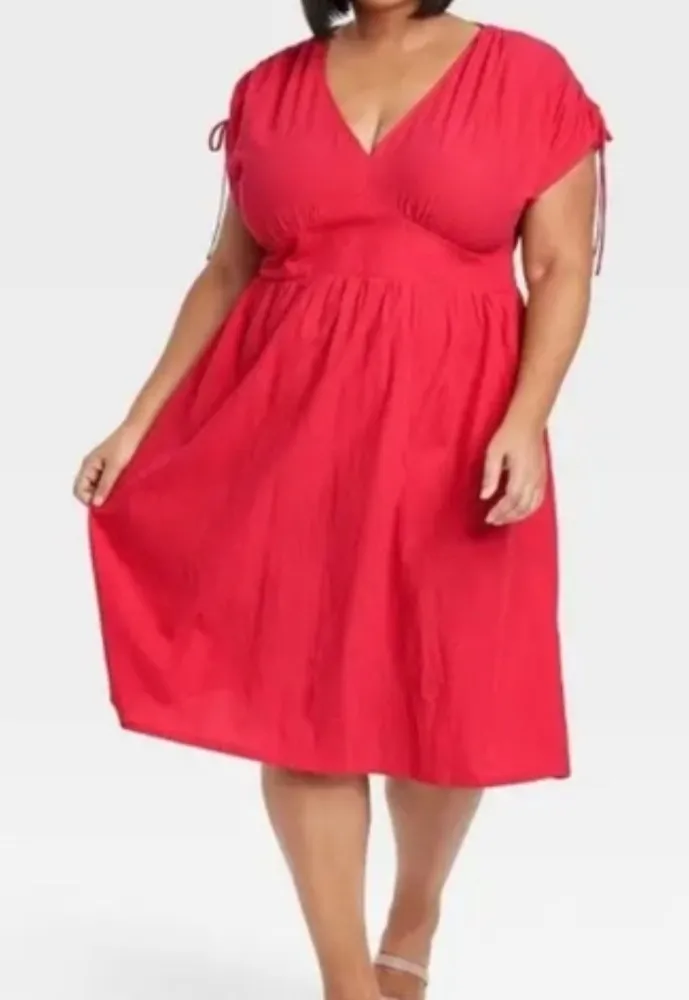 Ava & Viv‎ Cotton V-neck Midi Dress Size 2X EUC Pockets Ruched Tie Shoulder Pink - $18 - From Karla