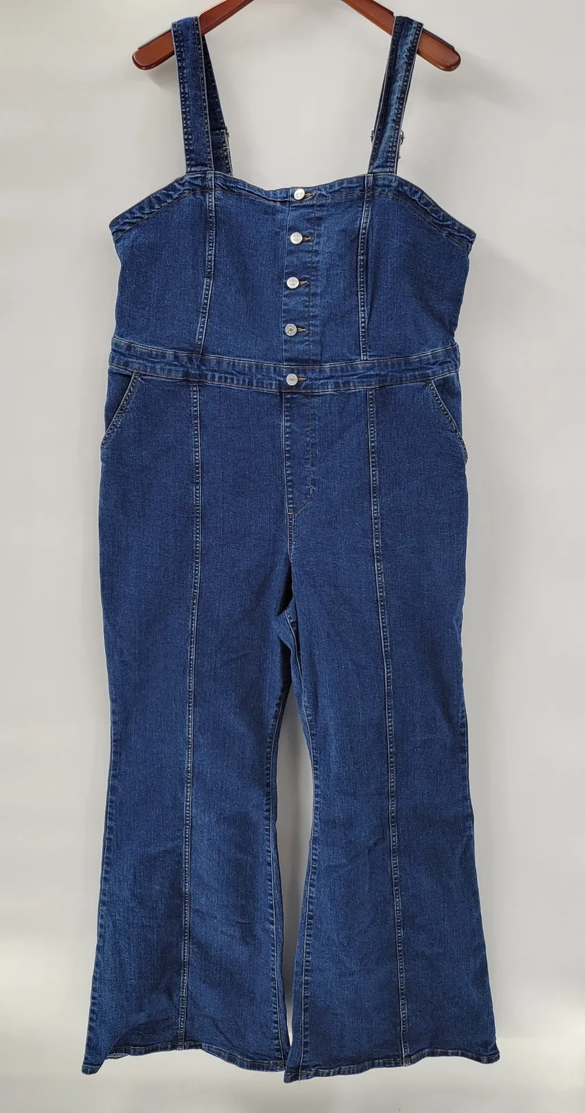 AVA & VIV women's denim jumpsuit featuring a flattering bell bottom flare leg silhouette. This stylish one-piece showcases a classic button-front closure with adjustable straps for a customized fit. The panel detailing along the legs adds a touch of modern design. Two front pockets offer practical storage. Measurements: 21" pit to pit x 62" from top of strap x 32" Inseam x 14" rise x 14" Hem Width Department: Women Type: One-Piece Style: Overall Fabric Type: Denim Theme: Bohemian Material: Cotton, Spandex, Polyester Blend Sleeve Length: Sleeveless Pattern: Solid Occasion: Casual Set Includes: Pants Number of Pieces: 1 Piece Accents: Button, Zipper, Strap Leg Style: Flared Keywords: denim jumpsuit, bell bottoms, flare leg, button front, plus size, one piece, casual wear, streetwear, vintage inspired, wide leg, strappy, distressed denim, utility Shop Policies & Vibes: * Orders ship same-day if placed by 3pm EST on USPS mail days. * All items are stored in a clean, smoke-free environment. * Most pieces are lovingly used and may show gentle wear. * I mark any irregularities with an * — most are minor or fixable. * Questions? Ask away — I want you to love what you get! Thanks for shopping with me!