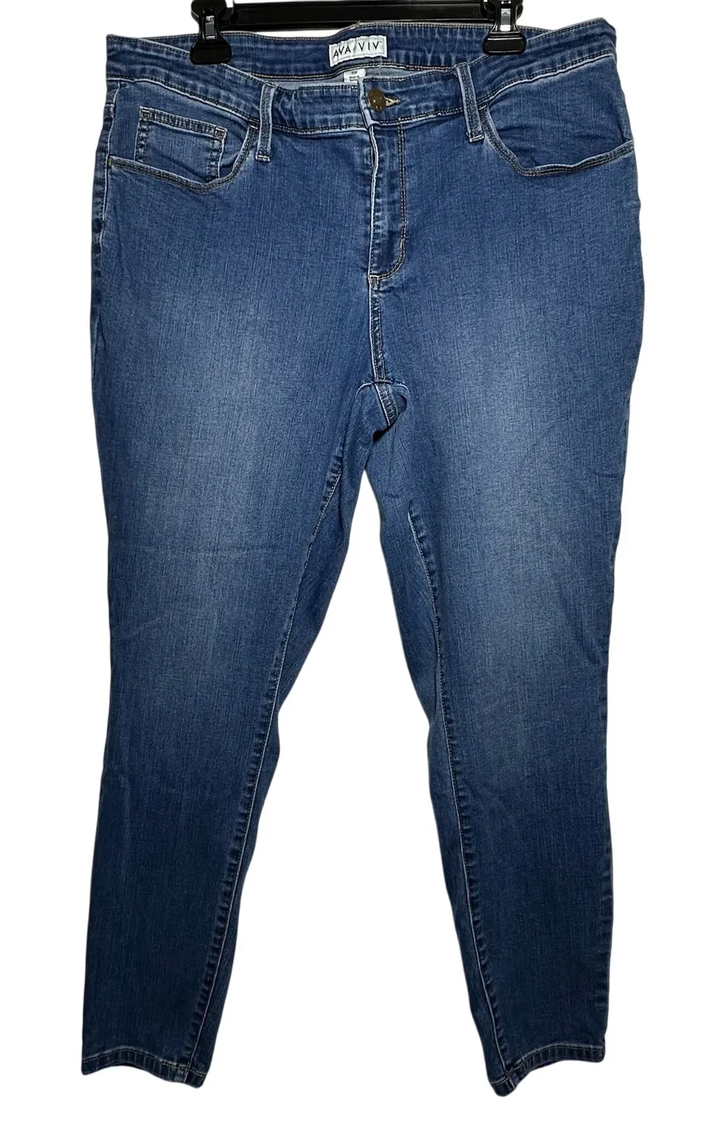 AVA & VIV women's blue wash denim jeans in a skinny fit with stretch. These jeans offer a classic five-pocket design with a zip fly and button closure. The denim is crafted for comfort and a flattering silhouette. Measurements: • Waist: 18 1/2 in (37 in total) • Inseam: 27 1/2 in • Rise: 10 1/2 in Style: Skinny Department: Women Fabric Wash: Medium Waist Size: 37 in Type: Jeans Accents: Button, Zipper Features: Pockets, Stretch, Distressed, Easy Care Fit: Classic Pattern: Solid Rise: Mid (8.5-10.5 in) Fabric Type: Denim Inseam: 27.5 in Material: Cotton Blend, Recycled Polyester, Spandex, Other Fiber Keywords: AVA & VIV jeans, women's denim, skinny jeans, stretch denim, plus size jeans, blue jeans, everyday wear, casual pants, comfortable fit, wardrobe staple, distressed denim, basic denim Fast shipper- most items ship within 1 day!
