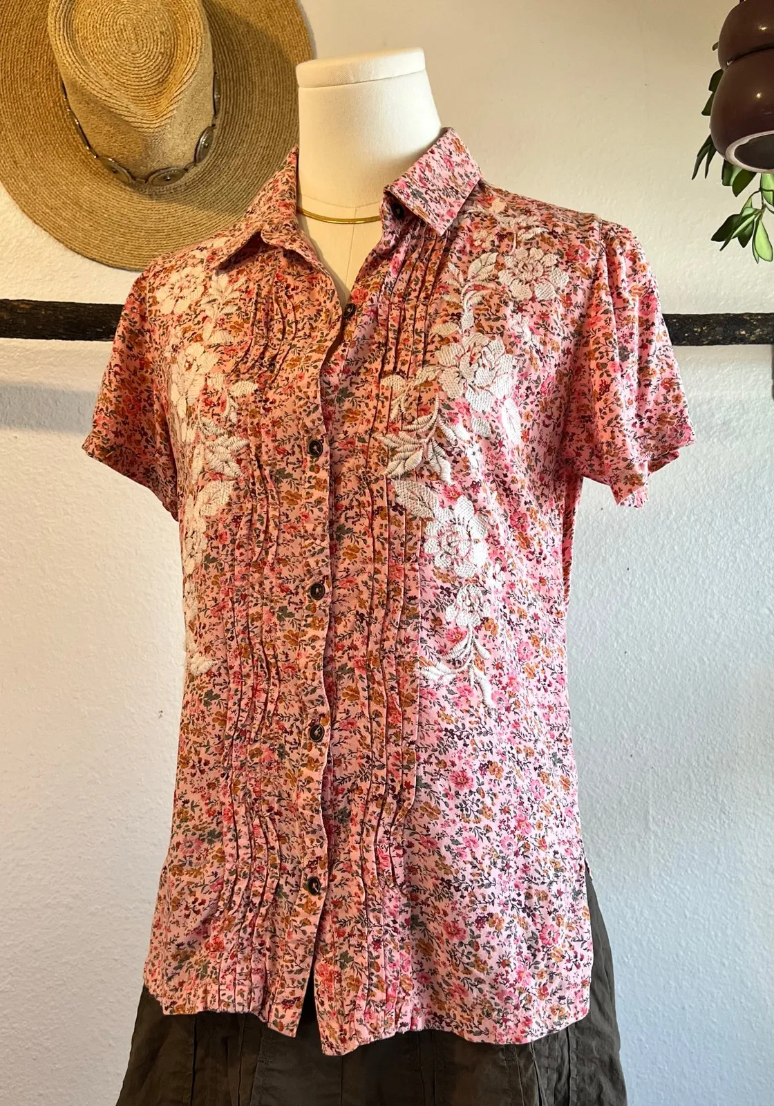 Flat Lay Measurements: Total Length- 24 Pit to pit- 17.5 Size- small Color- pink with floral and white Material- cotton Condition- gently worn in ***** Please note that vintage and handmade items are subject to more character, i do my best to note any visible flaws or imperfections ****** Open to offers & bundles Shipping Daily No Trades/Holds Smoke Free Home