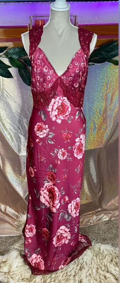 Chic burgundy maxi dress with floral design. Sleeveless and elegant. Ideal for special occasions. Sexy lace detailing with a side slit. Perfect for a valentine’s date night! Shell, lace and lining 100% polyester Hand wash in cold water, inside out hang to dry Lay flat measurements: Pit to pit = 20” Waist= 17” Hips= 22” Pit to hem= 52”