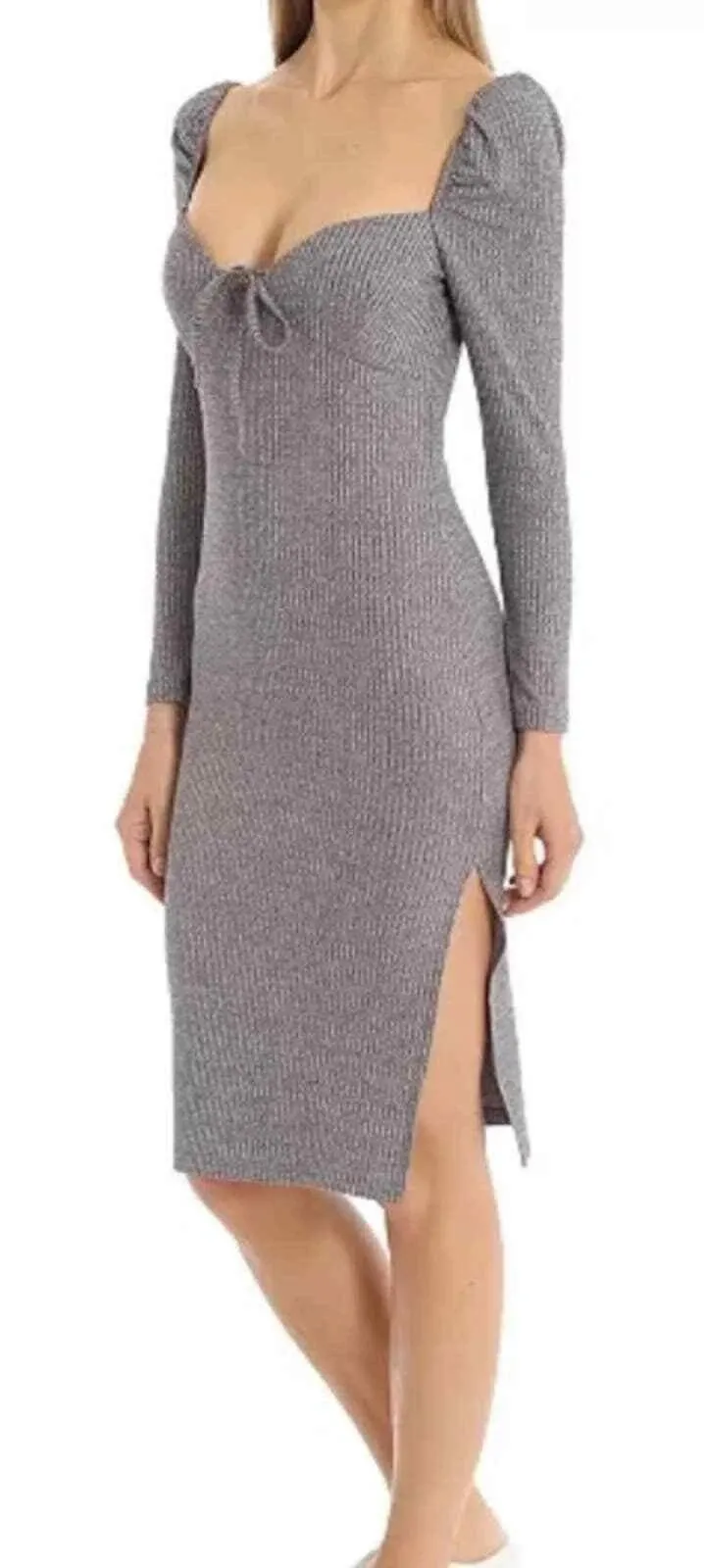AVEC LES FILLES Ribbed Knit Knee Length Dress Gray Small Gray knee length dress Ribbed knit Sweetheart/square neckline Puffy shoulders Tie front detail with small cutout Side slit Poly, rayon, spandex blend EXCELLENT PRELOVED CONDITION, no flaws Size small 15" pit to pit, 40" long
