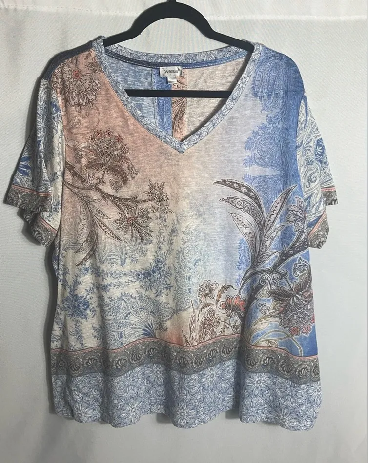 Avenue women’s plus size short sleeve top featuring a beautiful paisley and floral mixed print in shades of blue, pink, and cream. Accented with intricate bead embellishments for added sparkle. Soft, lightweight fabric with slight stretch. Flattering V-neckline and relaxed fit make it perfect for casual wear. Size: 22/24 (Plus) Measurements (approx.): • Bust (pit to pit): 26” • Length (shoulder to hem): 29” Material: • Self: 94% Polyester, 6% Flax • Contrast: 100% Polyester Condition: Excellent pre-owned condition with no flaws noted. Shipping weight: 9 oz Hashtags: #PlusSizeStyle #PaisleyTop #AvenueClothing #BeadedTop #BohoChic