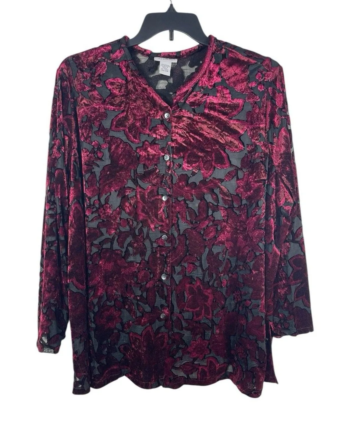 The Avenue 26/28 Velvet Burnout Blouse in Burgundy with Floral Pattern is a versatile top perfect fo... Show more