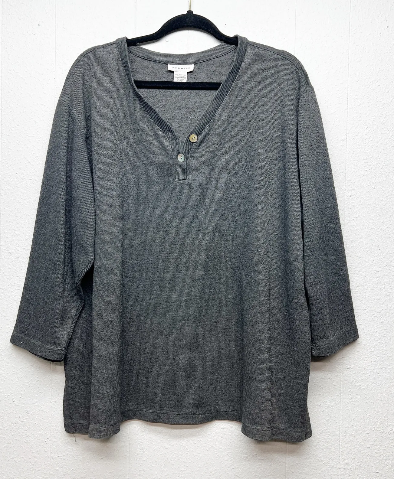 Avenue women's henley sweater. V-neck. Long sleeves. Side sits. Ribbed. Stretch. Heavy fabric. In good used condition. No stains, tears or holes. Polyester rayon blend. Machine wash. Length: 28"