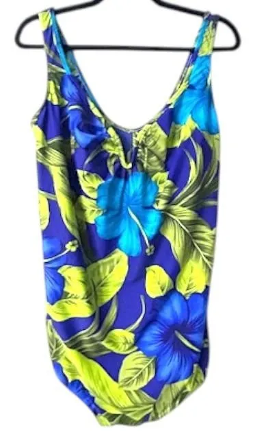 Measurements: •PTP (Across Chest): 18 in • Waist (around): 35 in • Length: 29.5 in Type: One Piece Department: Women Theme: Tropical, Floral Material: Nylon, Spandex Features: Sleeveless, Stretch, Lined, Quick Dry Swim Top Style: Tank Pattern: Floral Strap Type: Wide Strap Condition: New without tags, still has sanitary liner attached Keywords: tropical print, hibiscus flowers, plus size, made in Canada, nylon spandex, tankini alternative, beachwear, poolside, vacation outfit, summer fashion, resort wear, blue and green, one piece