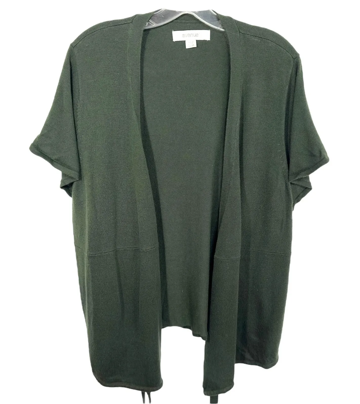 An open-front cardigan in a solid olive green hue. This plus-size cardigan features short sleeves and a relaxed fit, perfect for layering. The design includes a straight hem and an open-front style, making it versatile for various outfits. Wear it over a casual tee and jeans for a relaxed daytime look, or pair it with a dress for a more polished ensemble. Ideal for everyday wear or a casual office setting. Chest: 28" across Length: 26" Style: Cardigan Color: Green Department: Women Type: Sweater Material: Knit Sleeve Length: Short Sleeve Neckline: Round Neck Features: Open Front, Lightweight, Plus Size, Relaxed Fit Pattern: Solid Sleeve Type: Cap Sleeve Fabric Type: Knit Very good, pre-owned condition! Keywords: Avenue, plus size cardigan, open front cardigan, short sleeve cardigan, olive green cardigan, womens cardigan, plus size sweater, casual cardigan, knit cardigan, relaxed fit cardigan, layering cardigan, size 22/24, womens plus size, green sweater Smoke-free, pet-free. Ships within 1 to 2 business days. Save the planet. Shop second hand.