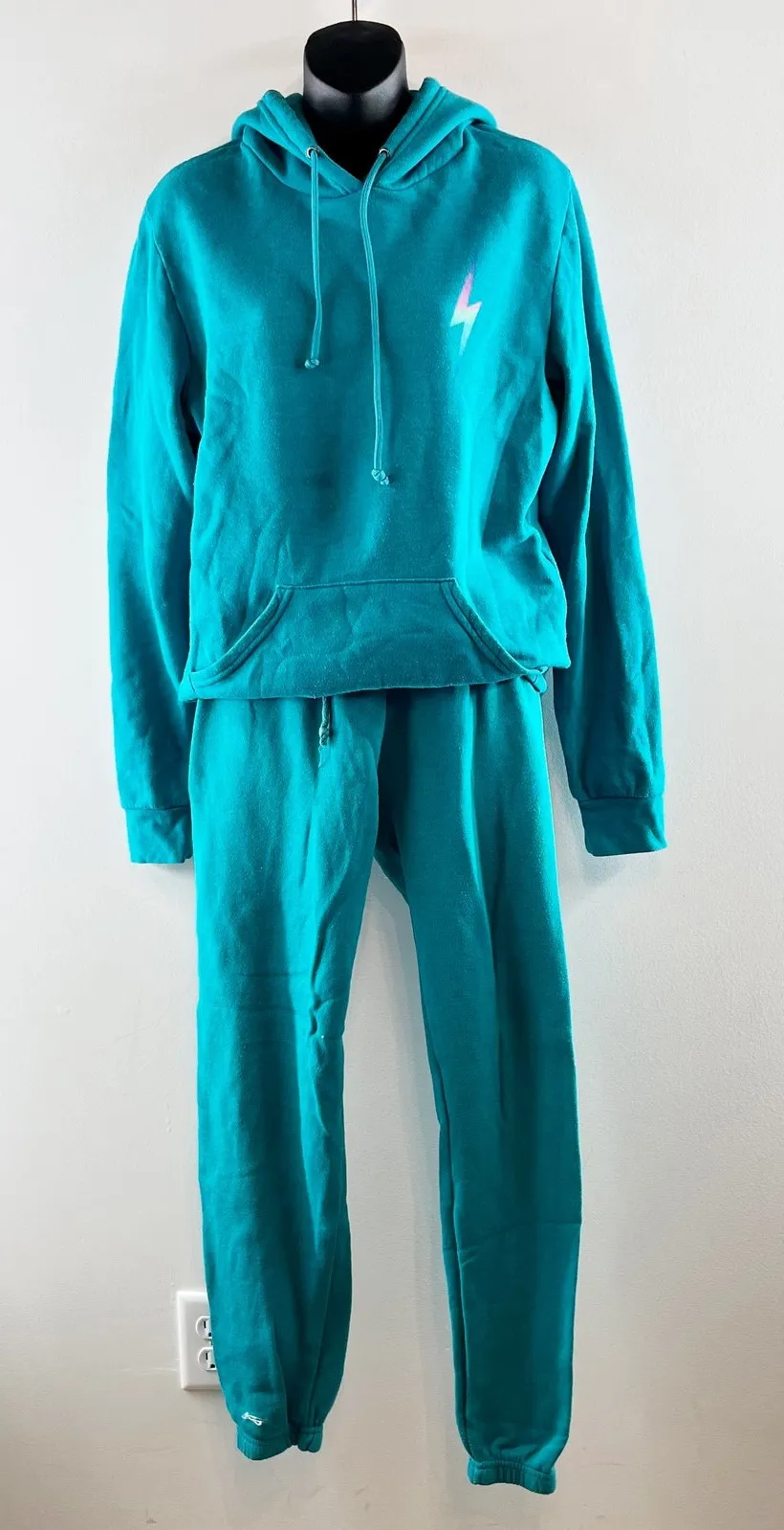 Brand - Aviator Nation Size - Top is Medium / Bottoms are S Preowned Condition - light wash wear throughtout pullover, bolt, hoodie, teal, blue, green, travel set, comfort, matching, sweatpants, drawstring, elastic waist, lounge, soft