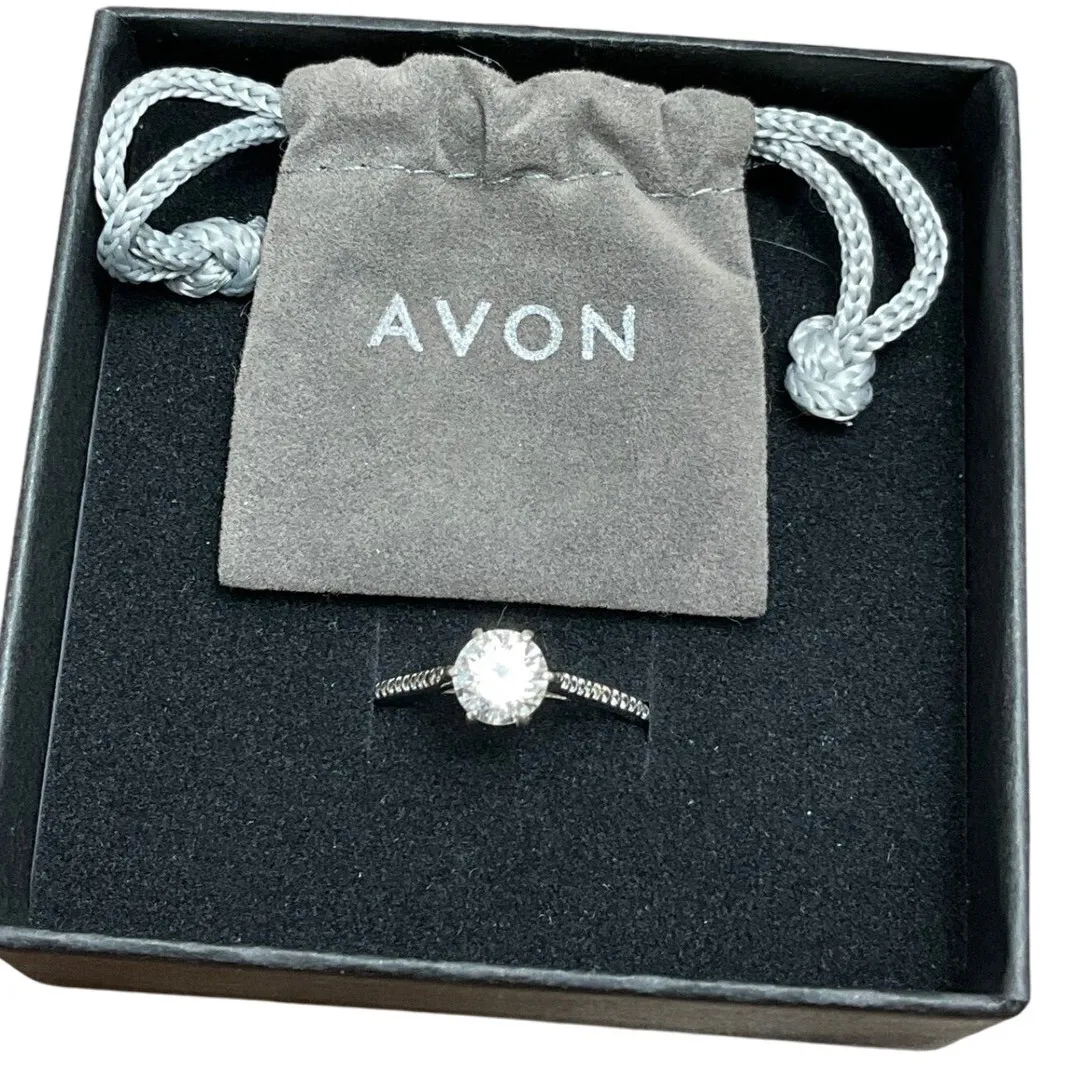 A radiant statement piece awaits with this Avon ring. A central round-cut cubic zirconia sparkles brilliantly, embraced by a pave band that adds extra shimmer. The sterling silver setting provides a classic and elegant foundation for this eye-catching design. This ring arrives complete with its original box and dust bag, making it perfect for gifting or safekeeping. Wear it to elevate your everyday style, add a touch of glamour to a special occasion, or complete a sophisticated evening ensemble. Ring Size: 7.5 Type: Ring Metal: Sterling Silver Color: Silver Number of Gemstones: Pave Set Main Stone Color: White/Colorless Main Stone: Cubic Zirconia Style: Cocktail, Band Material: Crystal, Stone Main Stone Shape: Round Main Stone Creation: Lab-Created Metal Purity: 925 Setting Style: Halo Keywords: Avon ring, sterling silver ring, cubic zirconia ring, pave ring, round cut ring, size 8 ring, silver ring, fashion ring, cocktail ring, statement jewelry, gift for her, jewelry, ring