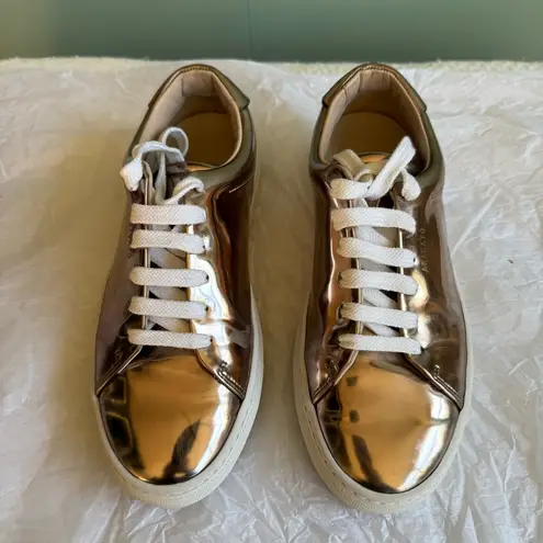 Very good used condition. They have only been worn 2-3x and show slight signs of wear and creasing, as seen in the photos. A minimalist shoe in a statement mirrored metallic leather colorway. They're well made and fully lined in leather. Fairly similar to Common Projects sneakers. Size EU 38 / US 7.5, but IMO they run about a half size small unless you have narrower feet. Official description below: The Clean 90 sneaker was designed in 2016 and has been an Axel Arigato icon ever since. Its streamlined profile is handcrafted from premium leather with a mirror-effect finish. Upper: 100% Leather Lining: 100% Leather Sole: 80% rubber + 20% recycled rubber; height measuring 30mm / 1.18" European Sizing Logo stamp in metallic gold Flat cotton laces Handmade in Portugal