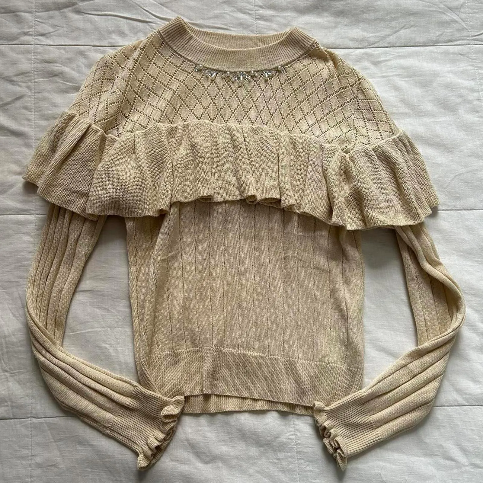 Axes Femme cream long sleeve sweater with ruffles beaded and pointelle detailing Tan Size M - $45 - From Killah