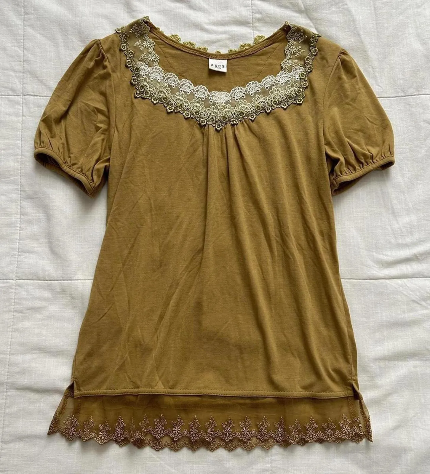 Axes Femme mustard yellow short sleeve tee with lace bib detailing Size medium - $35 - From Killah