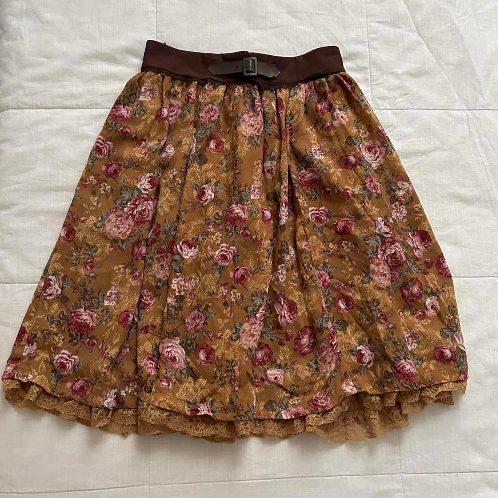 Axes Femme Orange Brown pink floral skirt lace trim and faux leather belt buckle Size M - $35 - From Killah