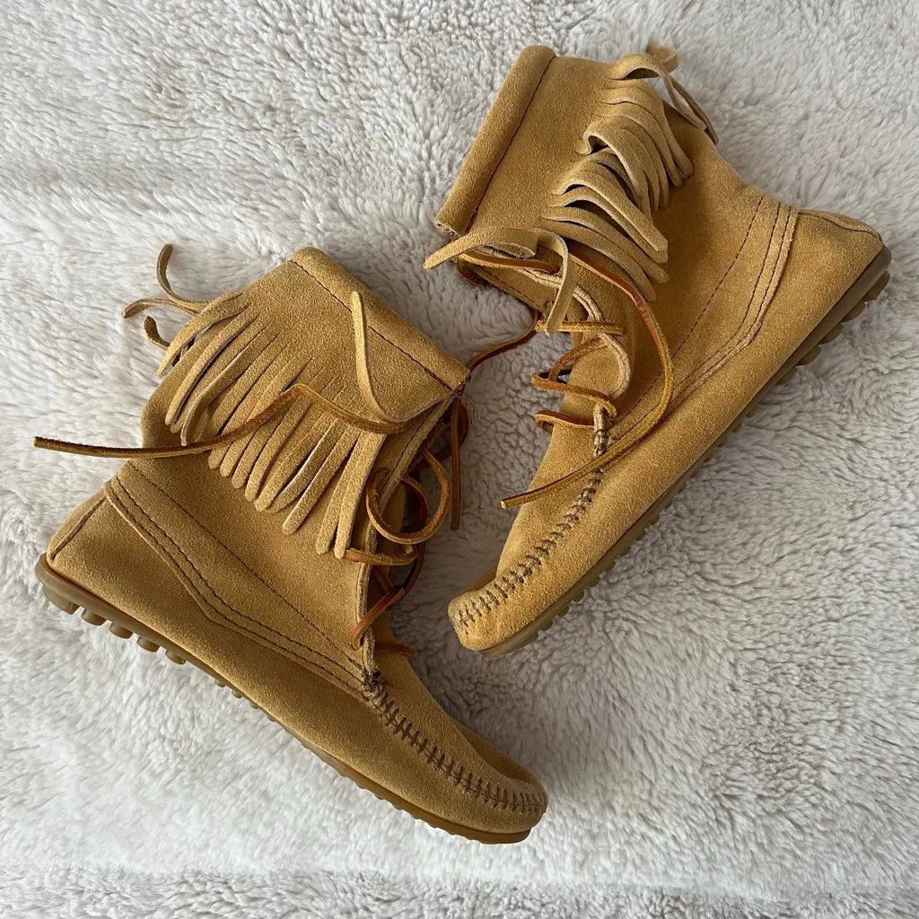 Women's Size 7 Minnetonka tan suede leather fringe moccasin boots These boots feature a soft suede u... Show more