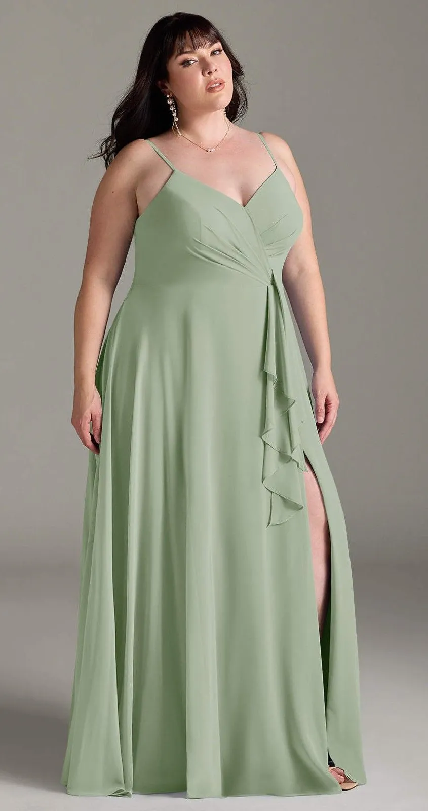 Look feminine and elegant while wearing our Akita dress. Cut from chiffon, this bridesmaid dress features a surplice V-neckline bodice with adjustable spaghetti straps. Delicate pleats wrap around the bodice and transition to a side cascading ruffle drape. This A-line skirt is complete with a flattering leg slit. Padded bust Boning Color is either dusty sage or agave Size 10 Measurements laying flat | Pit to pit | 17" Waist | 15" Length | 56"