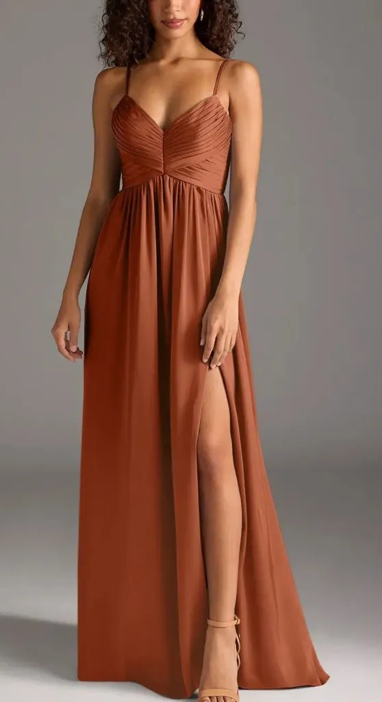 New never worn not altered See tag for measurements $129 retail Alia is our stretch satin bridesmaid dress that has perfect details for all your bridesmaids. Her delicately pleated V-neckline is held by adjustable spaghetti straps that drape over your shoulders. The front waist is an empire seam that sits atop a flowy gathered A-line skirt with a front side slit. We have also added pockets! Length : Floor-Length Fabric : Stretch Satin (Slight Stretch) Silhouette : A-Line Sleeves : Spaghetti Straps Neckline : V-Neck Back style : V back, Back Zip Embellishment : Pleated Features : With Pockets, Leg Slit, With Boning Padding : No Boning : Yes