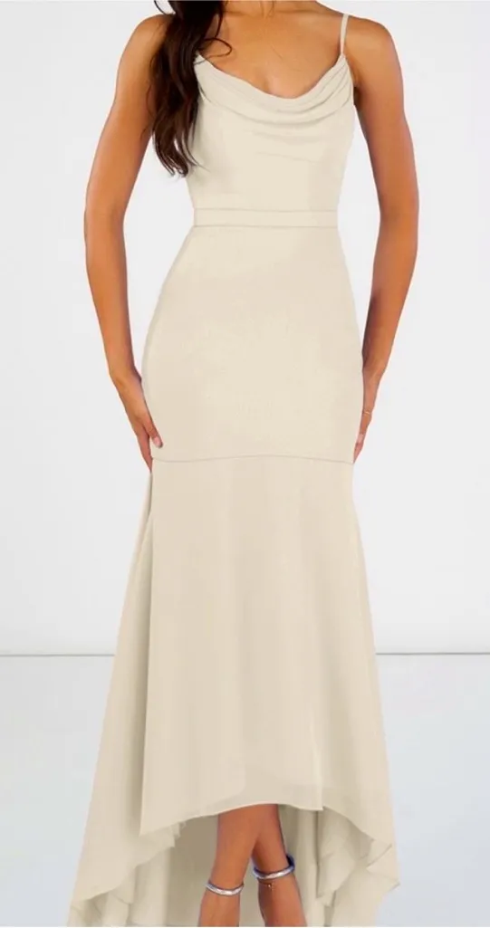 Worn once as a bride’s maid! No longer had tags. Still in great condition! *I will be having this dress dry cleaned once purchased!!!!* Style: Summer Asymmetrical chiffon dress Color: Frost Size: A6 (6 women’s) Super flattering, form fitting & curve hugging Gorgeous dress that can be worn for any formal occasion