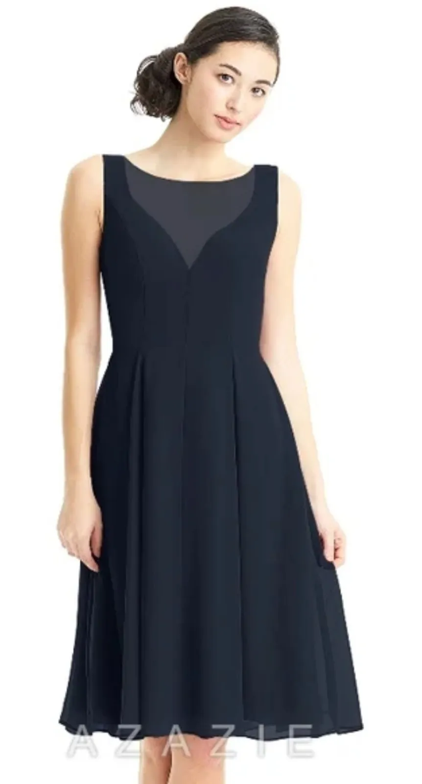 Solid Navy Blue Illusion V-Neckline Sleeveless Pleated Skirt Fit And Flare Silhouette Knee Length Back Zipper Closure Lined 100% Polyester Size 12 Measurements - See Pictures For Details - Excellent Condition - Smoke-free/pet-free House - Fast Shipper Tags: Party, Cocktail, Feminine, Bridesmaid, Homecoming, Prom, Holidays, Elegant, Semi-Formal, Holiday, Wedding guest, Banquet, Event, Mother of the bride, Mother of the, Special occasion, Party, formal, wedding, evening dress, Sexy, Bridal, maxi, Formal Gown, Engagement Party, Reception Prom, Special event, Graduation, Formal, Military ball, Dressy, Gala, Feminine, Holiday, NYE, Christmas Eve, Photoshoot