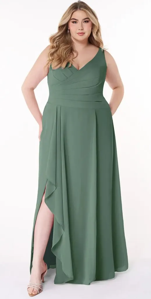 Kori is a sophisticated and elegant dress for your leading ladies. Made from chiffon, this bridesmaid dress features a tank V-neckline with a surplice overlap and soft pleating along the bodice. Her gorgeous A-line skirt features a cascading ruffle that flows beautifully along a side leg slit. Length : Floor-Length Fabric : Chiffon (Non-Stretch) Silhouette : A-Line/Princess, A-Line Sleeves : Sleeveless Neckline : V-Neck Back style : V back, Back Zip Embellishment : Pleated Features : Leg Slit, With Pads Padding : Yes Boning : No