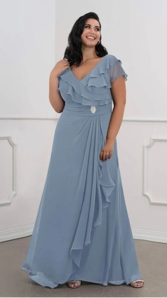 Brand new! Original price $179 + TAX AZAZIE SNAPDRAGON A-Line Ruched Chiffon Floor-Length Dress Dusty Blue Size A10. Measurements: pictures. Length : Floor-Length Fabric : Chiffon Silhouette : A-Line/Princess Straps & Sleeves : Short Sleeve Neckline : V-Neck Back Style : Back Zip Embellishment : Ruched