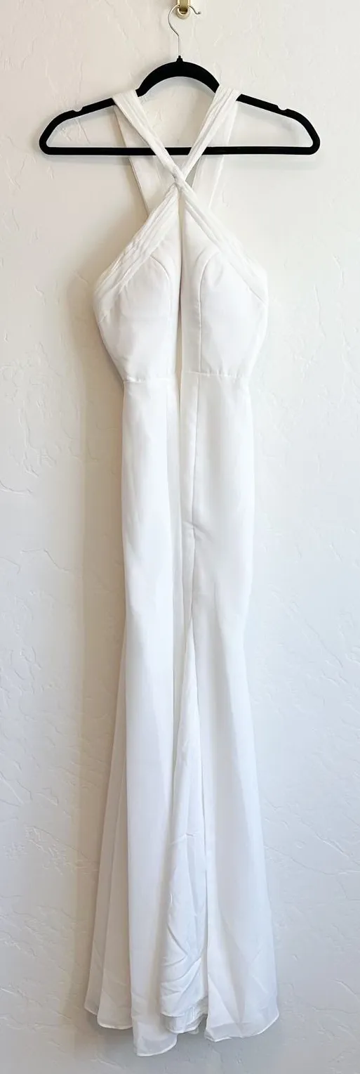 1-2 day ship time! ✨ Color: White Brand: Azazie Retail Price: $249 Condition: Very good pre-owned. Freshly dry-cleaned. Light discoloration at underarms and neckline. Smoke-free, pet-friendly home. Size: A2 (fits like XS / US 0–2) Elegant Azazie gown with halter neckline, pleated bust detail, and thick crisscross straps at back. Fitted bodice with padded bust and fishtail hemline for a sleek mermaid silhouette. Perfect as a wedding gown, rehearsal dinner dress, or formal evening gown. Keywords: halter gown, crossback dress, bridal dress, floor length gown, white formal dress, fitted bodice, rehearsal dinner, wedding reception dress, evening gown, fishtail silhouette, sleek modern gown, engagement photo dress, timeless white gown, special occasion dress, minimal bridal look, contemporary wedding dress